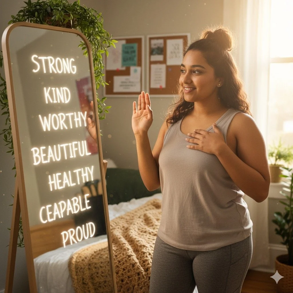 I started experimenting (because, why not? Nothing else was working). Instead of "Ugh, my thighs are huge," I'd try, "My legs are strong and carry me through every day." Instead of "I look so bloated," it became, "My body is working hard, and I'm nourishing it."